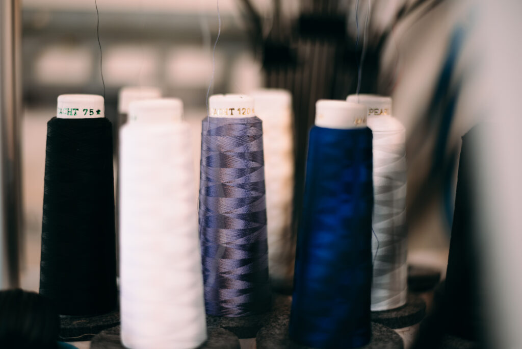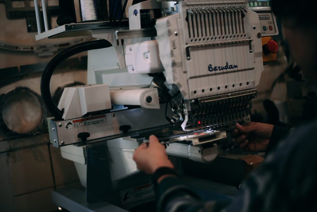 複雑に絡み合う音とキャッチーなリズムをイメージして作られたロゴを刺繍で最大限に表現するため、糸の太さや密度の調整を重ね、奥行きのある風合いに仕上げています。